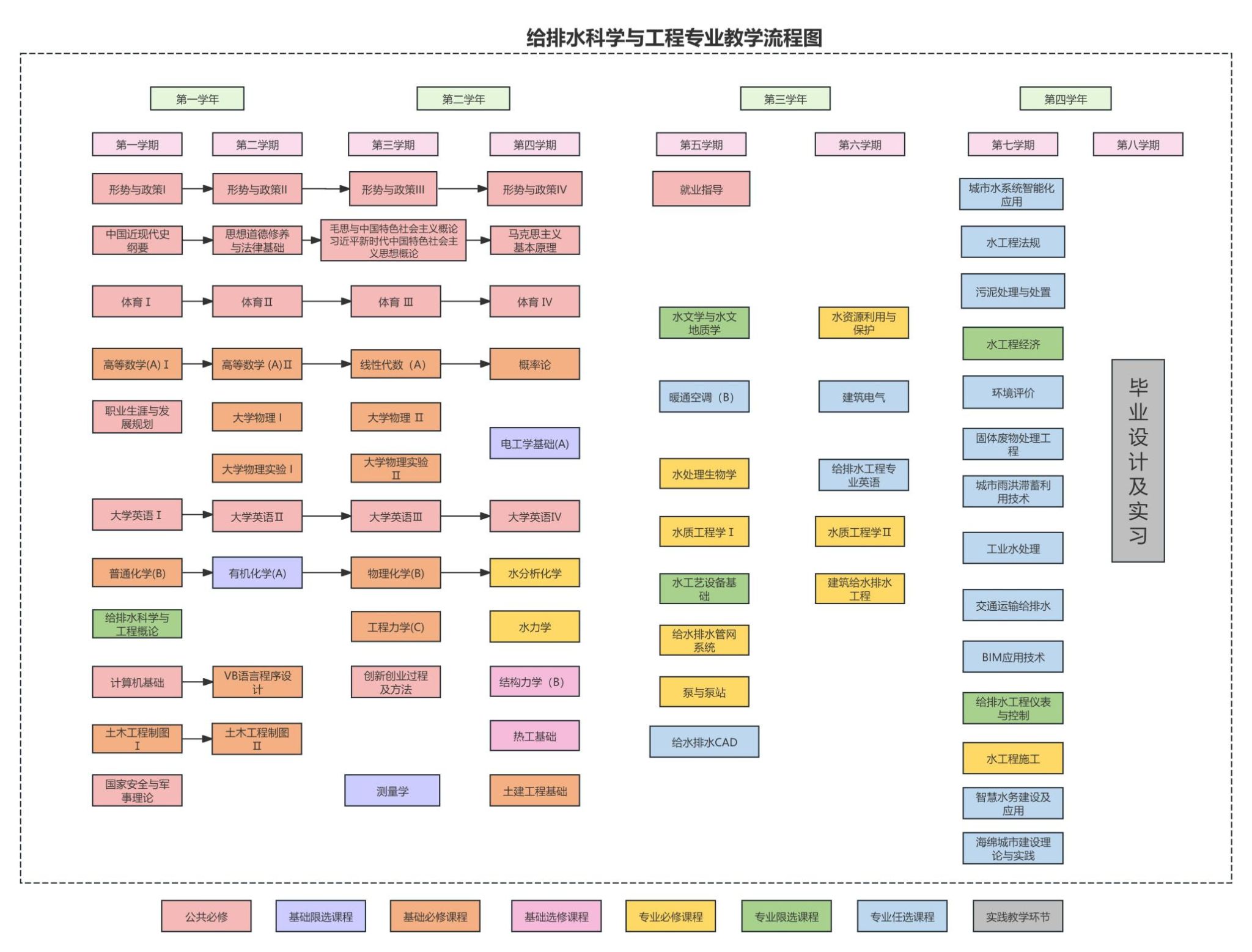 认识实习、生产实习、测量实习、水力学实验、化学实验、水处理生物学实验、水质工程学实验、课程设计、毕业实习、毕业设计等。