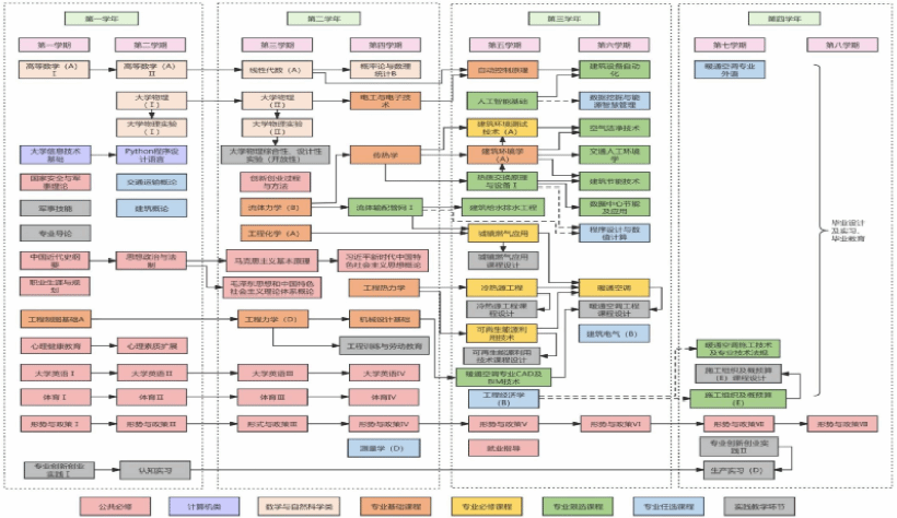 冷热源工程(4学分)、可再生能源利用技术(2学分)、城镇燃气应用(2学分)、建筑环境测试技术(A)(2学分)、暖通空调(5.5学分)。