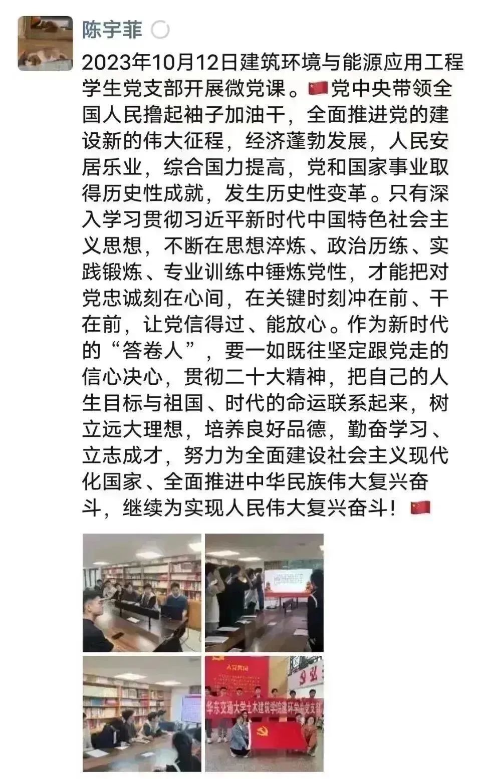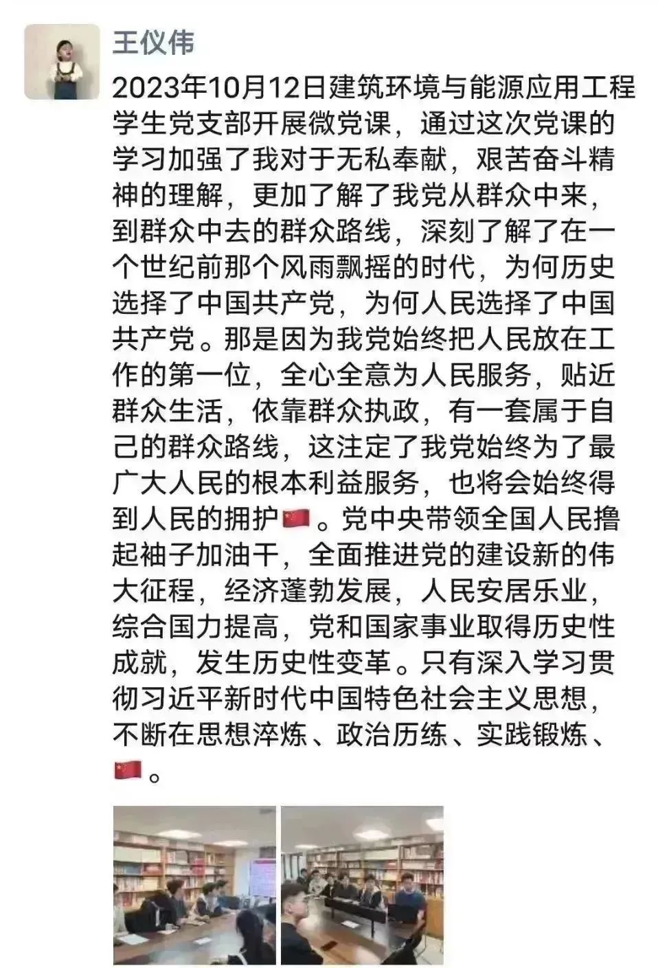 在杨学斌同志的带领下,建筑环境与能源应用工程学生党支部开展了主题为“谱写中华民族现代文明新华章”的党课。文明是一个国家、一个民族进步的标志。这次党课,目的是通过回顾改革开放以来,坚持走自己的路,秉持精神上的独立自主,增强以中国式现代化全面推进中华民族伟大复兴的信心和底气。对历史最好的继承,就是创造新的历史;对人类文明最大的礼敬,就是创造人类文明新形态。党的十八大以来,以习近平同志为核心的党中央团结带领全国各族人民,坚持把马克思主义基本原理同中国具体实际相结合、同中华优秀传统文化相结合,凝聚奋斗与思考、承继光荣与梦想,激活了中华文明的强大生命力,党和国家事业取得历史性成就、发生历史性变革。