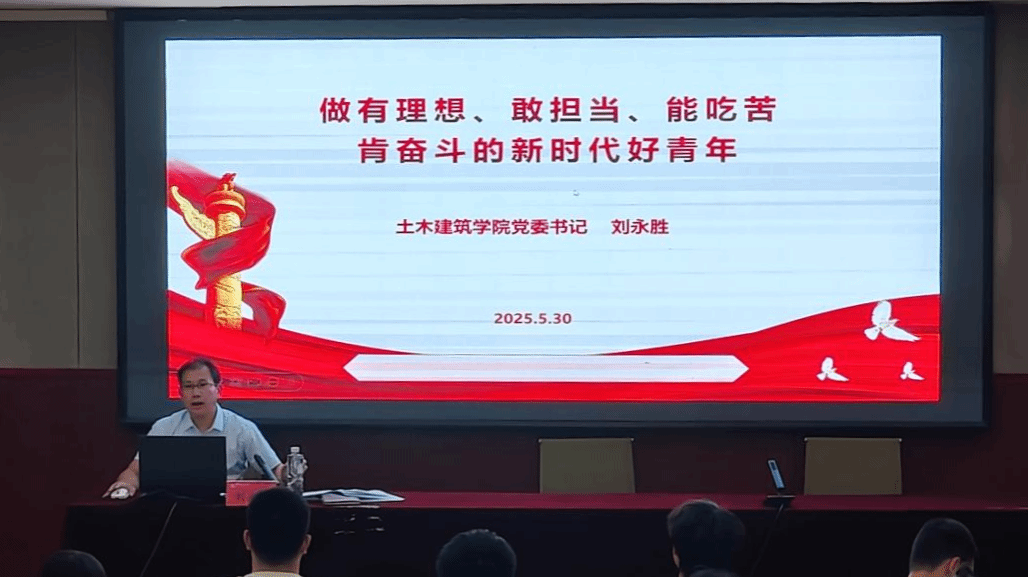 5月30日,尚香书苑 党委书记刘永胜为土建学院分党校第十期发展对象培训班学员讲授党课——《做有理想、敢担当、能吃苦、肯奋斗的新时代好青年》。
