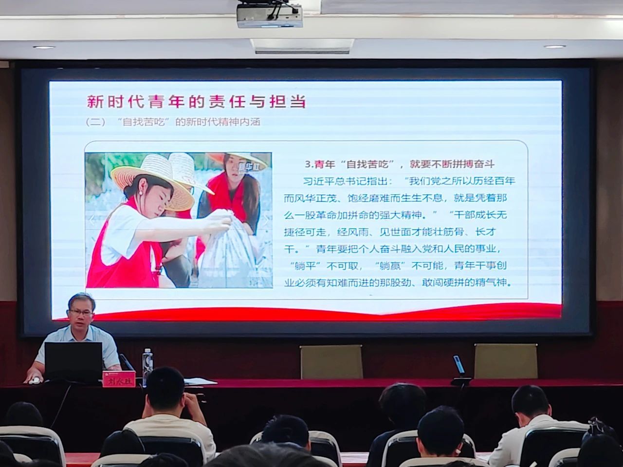 “青年强,则国家强。”刘永胜引用习近平总书记对广大青年的寄语,勉励学员们听党话、跟党走,立志做有理想、敢担当、能吃苦、肯奋斗的新时代好青年。随后详细解读了“自找苦吃”的新时代精神内涵,并通过讲述陈祥榕、黄文秀等优秀青年的感人事迹,让学员们真切感受到新时代青年的使命担当和奉献精神。