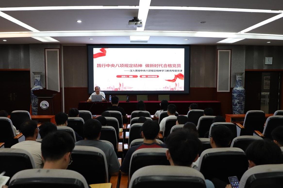 院党委委员、院长庄海洋联系结构工程教工党支部、结构工程研究生党支部及詹天佑班学生党支部,以“贯彻落实中央八项规定精神学习教育”为题讲授专题党课。首先强调了深入贯彻落实中央八项规定精神学习教育的重要性,并对中央八项规定精神的核心要义进行详细解读。他指出,党员干部要深刻理解中央八项规定精神的内涵,筑牢思想根基,强化行动自觉。