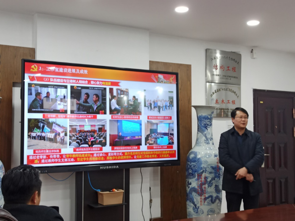 张鹏飞从年龄组成、荣誉和高级职称比例对支部成员进行介绍,汇报支部党建总体思路和目标,从“理论学习与实践教育相结合,政治站位有高度”“党建工作与中心工作相结合,双促双融有厚度”“队伍建设与立德树人相结合,凝心聚力有温度”三方面介绍工作室建设进展及成效,以及工作室下一步工作计划。