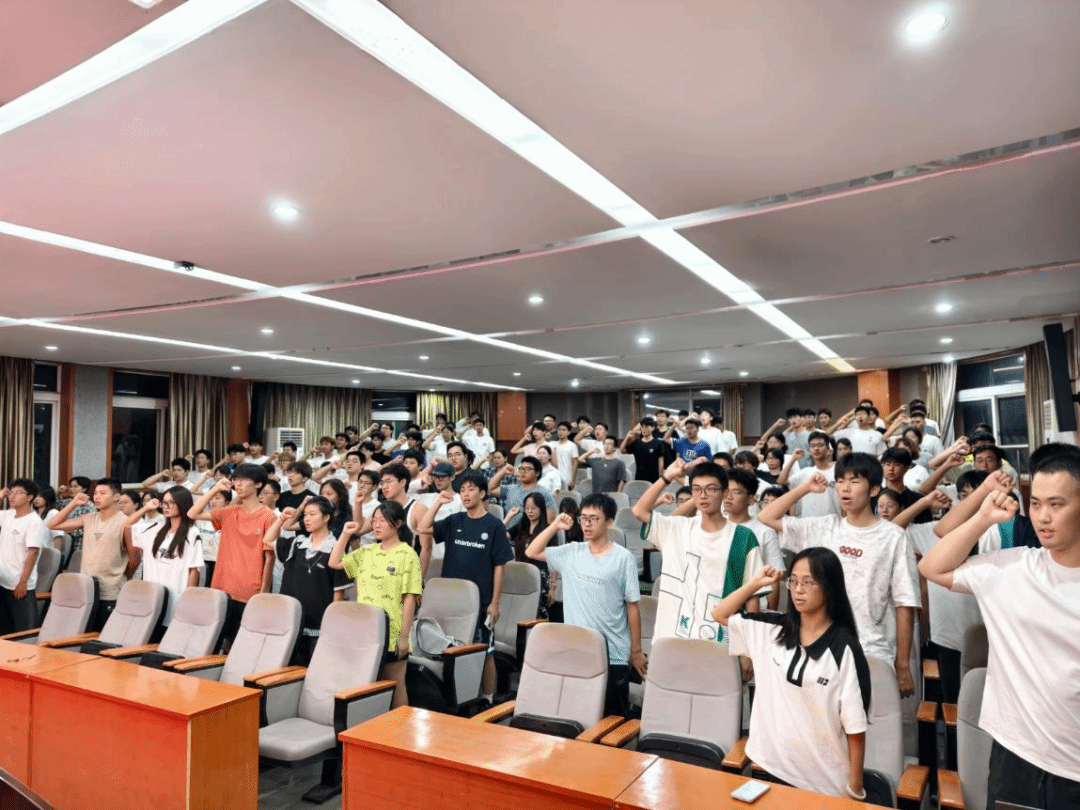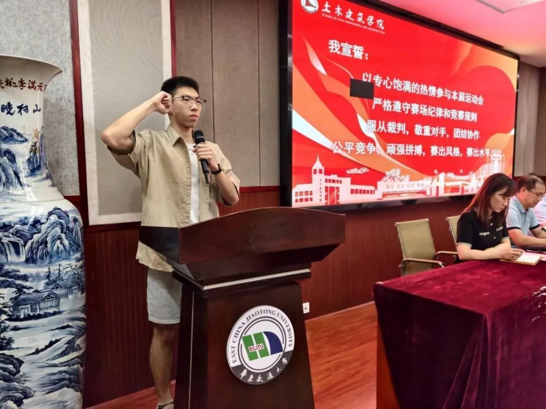 在优秀运动员代表江庭晖的带领下,全体队员庄严宣誓,承诺将以积极拼搏的姿态投入比赛,恪守赛纪、团结协作、勇创佳绩,为学院荣誉而战。