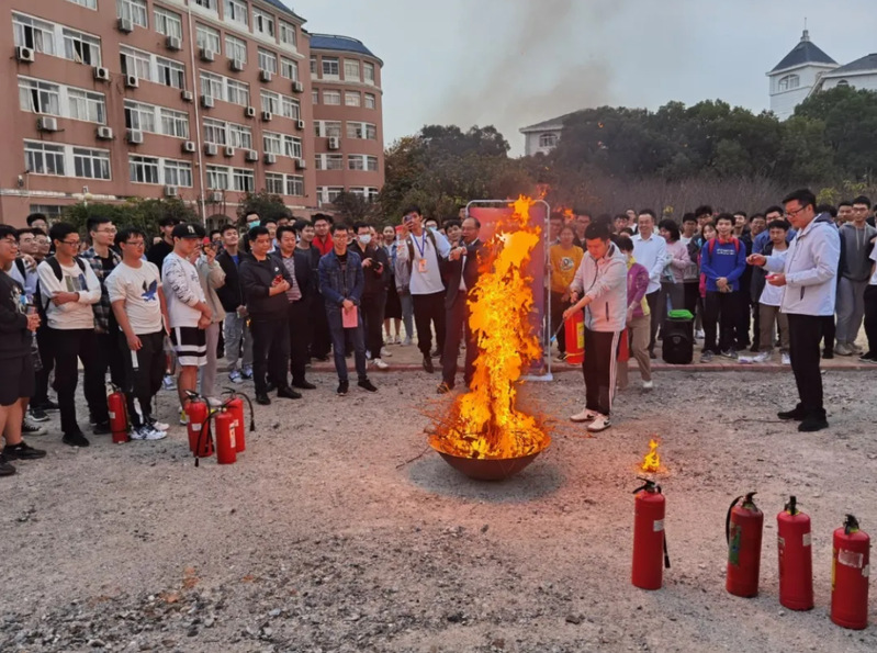 演练过程中,梁珂老师向全体师生进行演练前培训,讲述灭火器使用的注意事项以及使用灭火器材“提、拔、握、压”的四个步骤,并让同学们使用灭火器材进行实践操作。