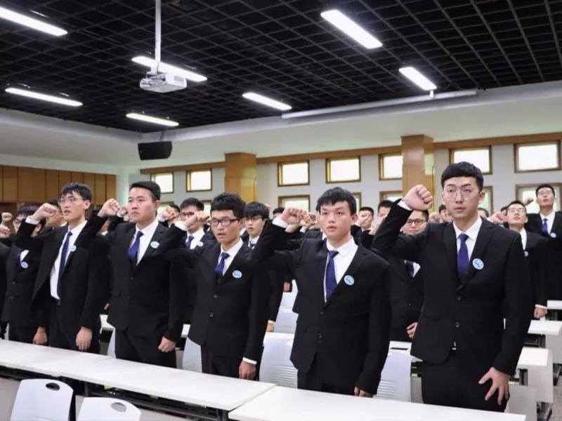 典礼中,吕月胜和张坚为第五届中铁国际工程班授旗。学生代表刘兆昆带领全班宣誓。