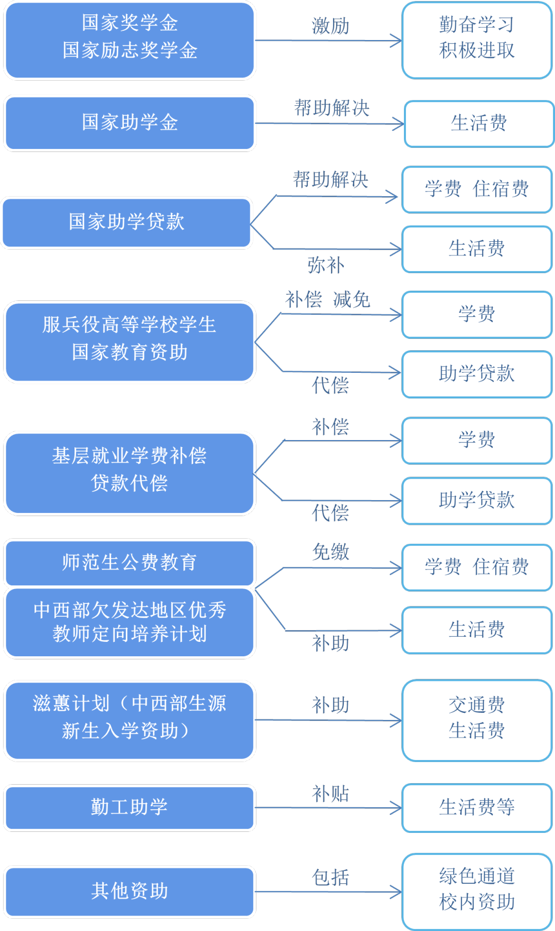 学校利用事业收入提取资金以及社会捐助资金,设立奖学金、助学金、困难补助、伙食补贴、校内无息借款、学费减免等校内资助项目。
