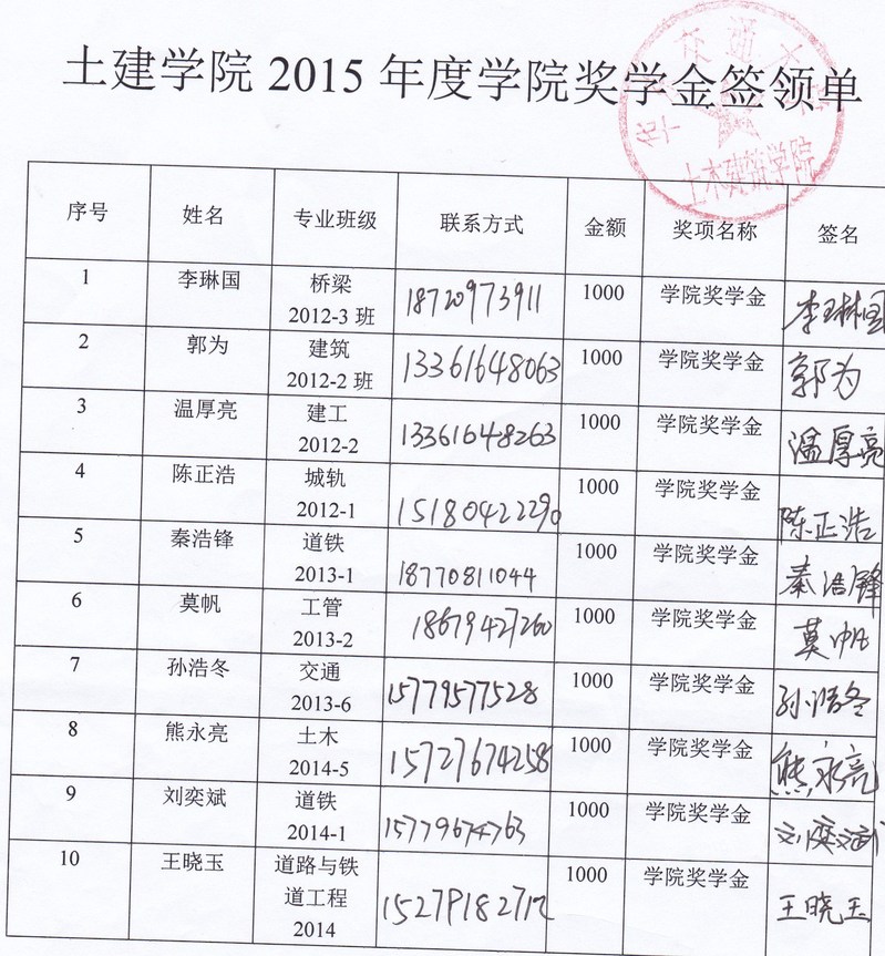 2015中铁七局奖学金奖金签收单