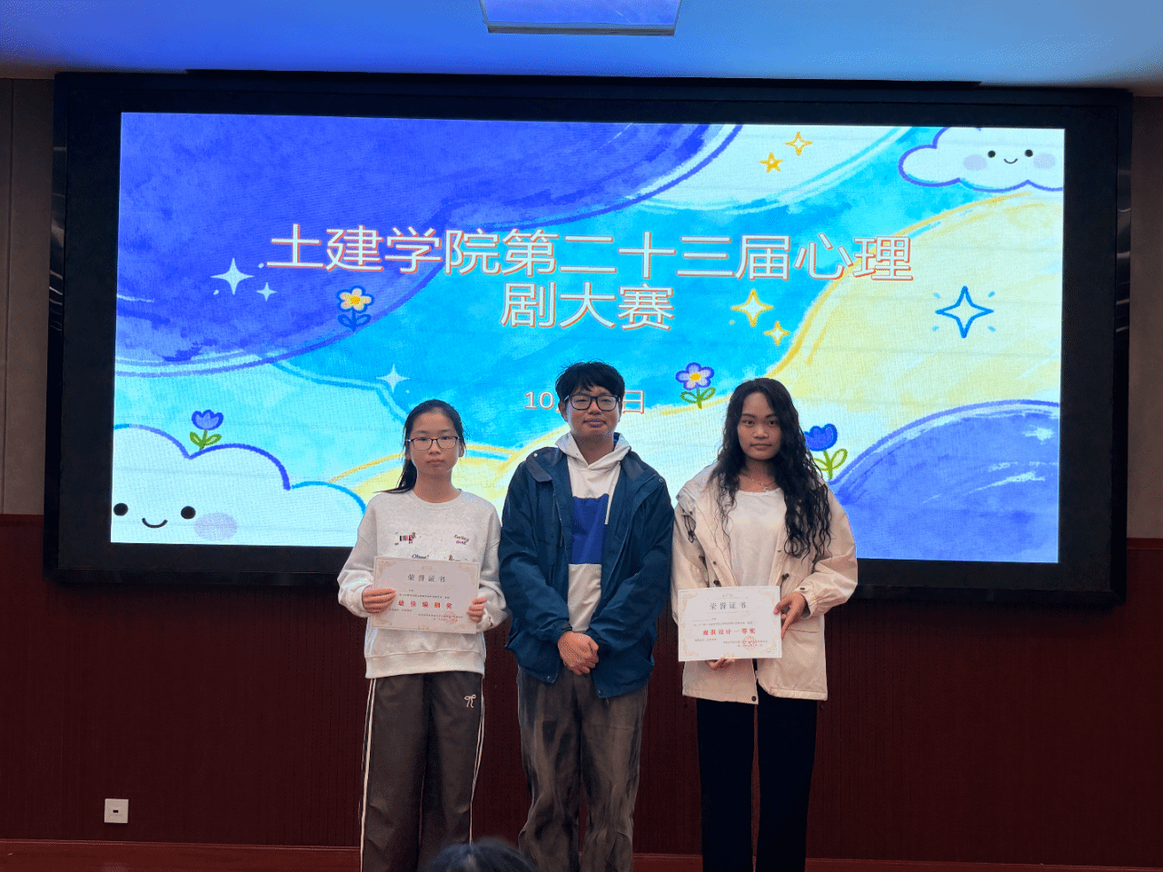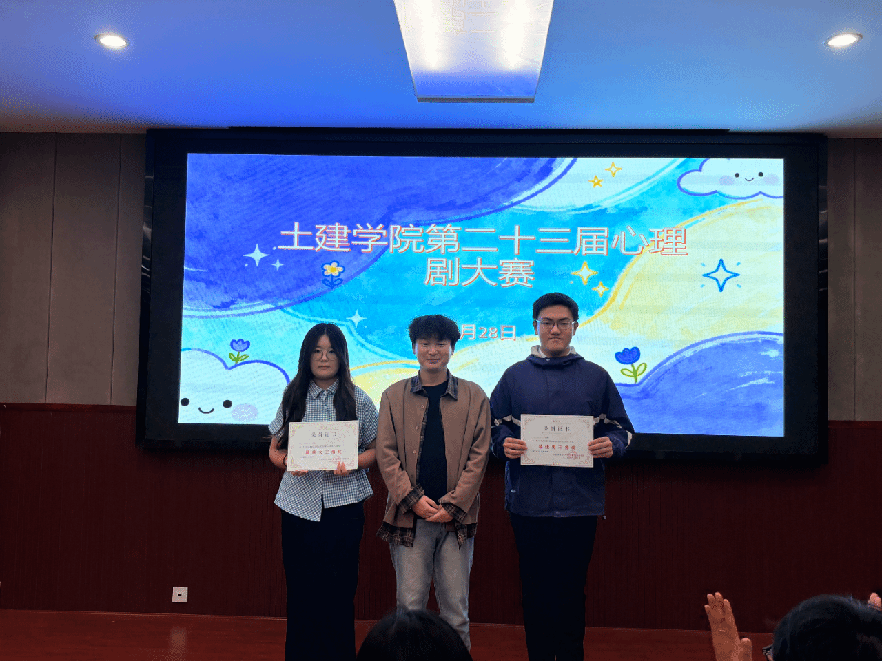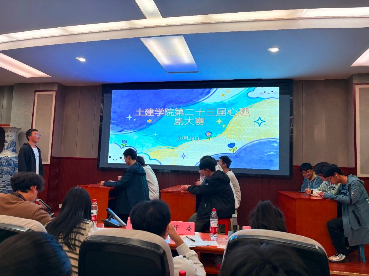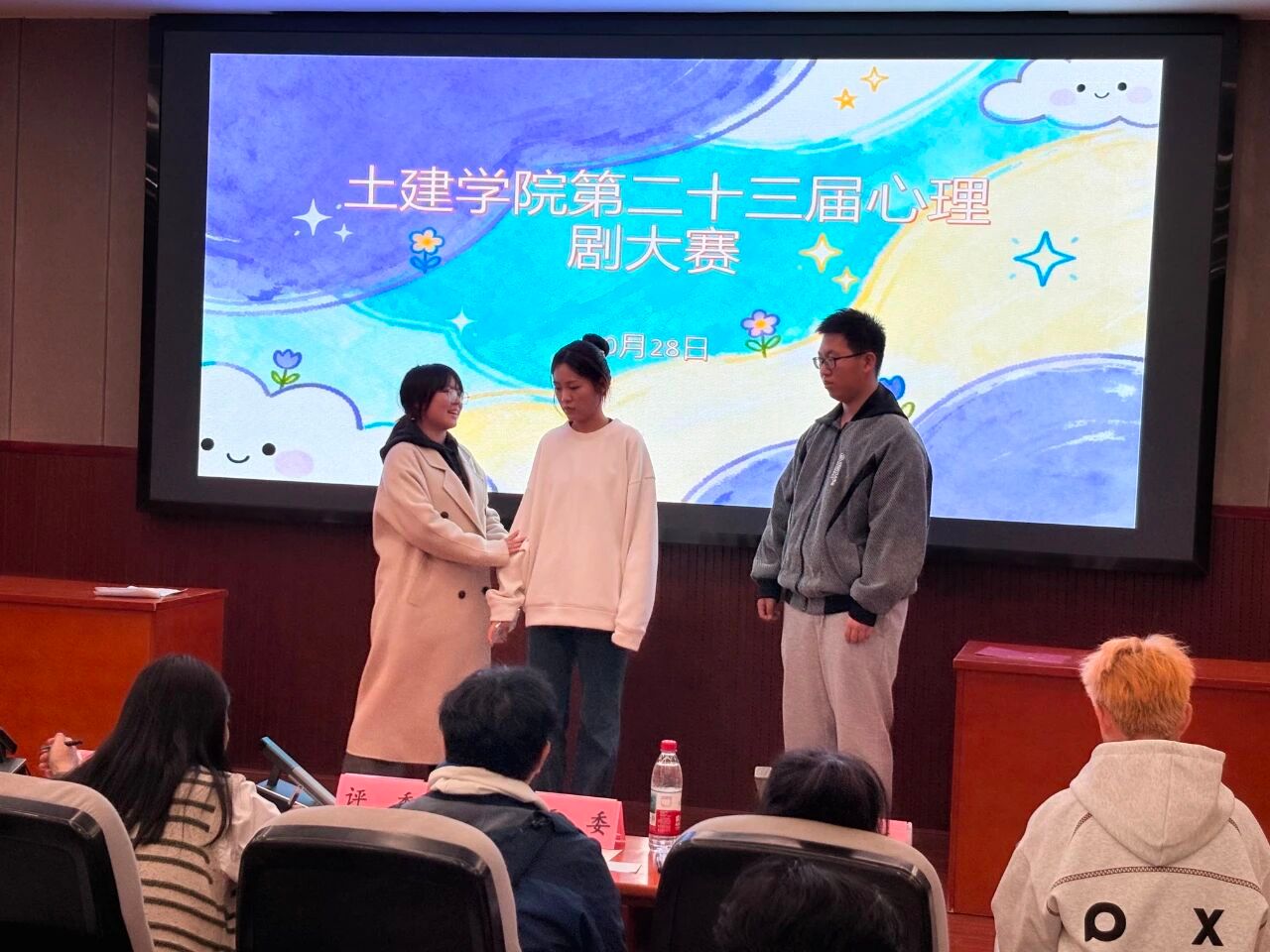 为了帮助大一新生更加了解自己的心理活动和内心世界,提高同学们的交流与合作,陪伴他们健康成长。10月28日晚上7点,土建学院心素会在土建200开展心理情景剧大赛,学院心理辅导员汪晶晶老师,汪满老师,校心联主席王泽梁,研究生学长李云帆,研会主席练文静等出席此次决赛并担当评委。