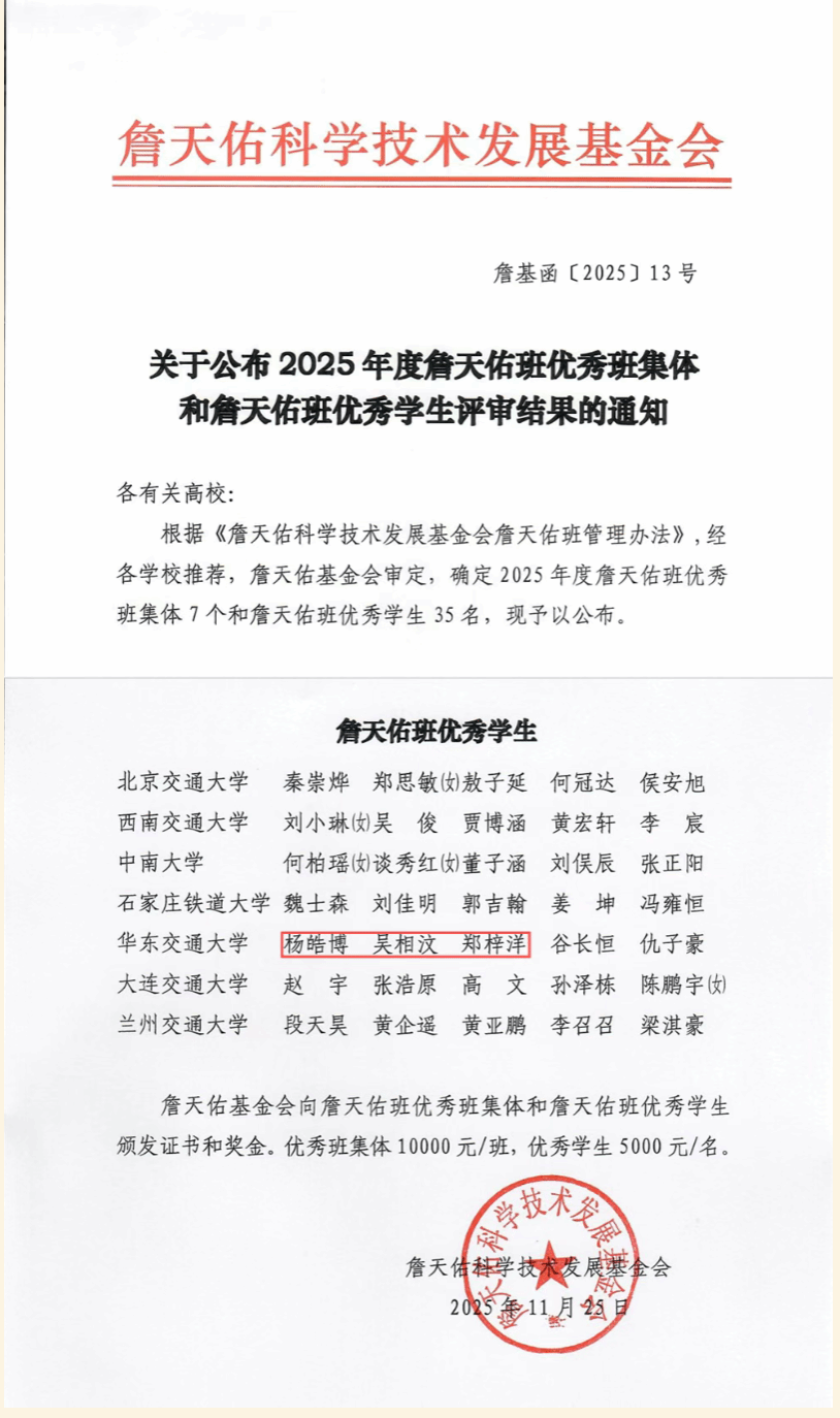 近日,经各校推荐与詹天佑科学技术发展基金会审定,尚香书苑 杨皓博、吴相汶、郑梓洋三位同学荣获2025年度全国“詹天佑班优秀学生”称号。