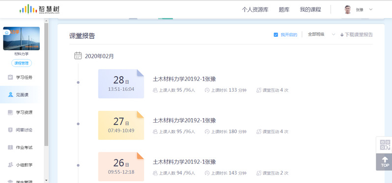 根据教研室前期讨论结果,工程力学教学团队线上教学工作稳步推进,并保证每次课后总结在线教学经验,并在教学微信群中面对突发问题商讨解决方案。各位教学老师依托已有的国家级(或省级)线上精品课程进行线上教学,教学资源优异;根据平台数据掌握学生学习情况。