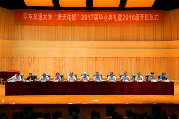 于艺术学院音乐厅举行2017届詹天佑班毕业典礼暨2016级詹天佑班命名典礼。詹天佑科学技术基金会理事长蔡庆华出席典礼并为现场师生作《中国的高速铁路》专题讲座,詹天佑科学基金会副理事长兼秘书长宋凤书,副秘书长赵炎、周建昌,校党委书记万明,校长罗玉峰出席。党委副书记汪立夏主持典礼。土建、交运学院领导、“詹天佑班”辅导员和全体学生共计500余人参加活动。