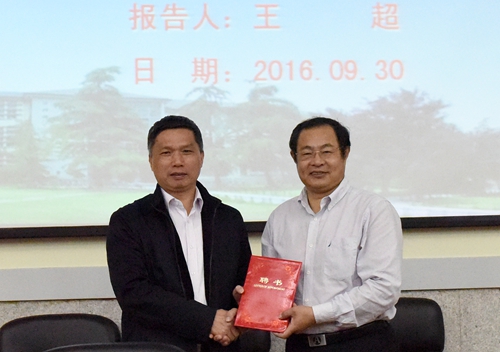 日新客座教授证书。王超院士还受邀来校做“科学谋划、质量提升、发展跨越”学术报告。副校长史焕平教授主持。