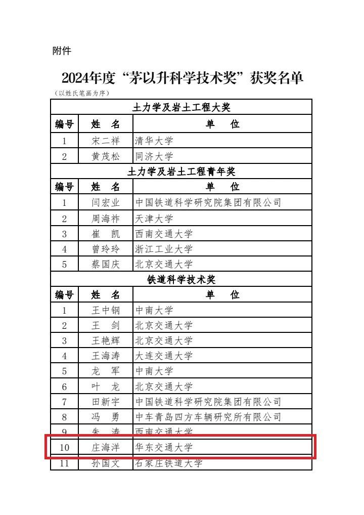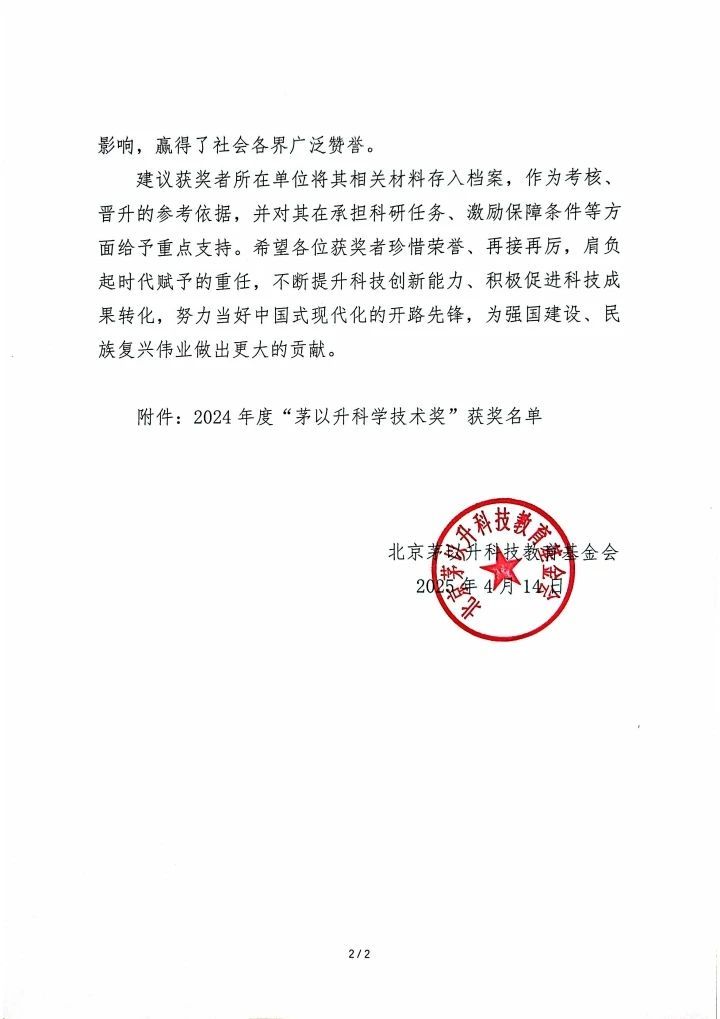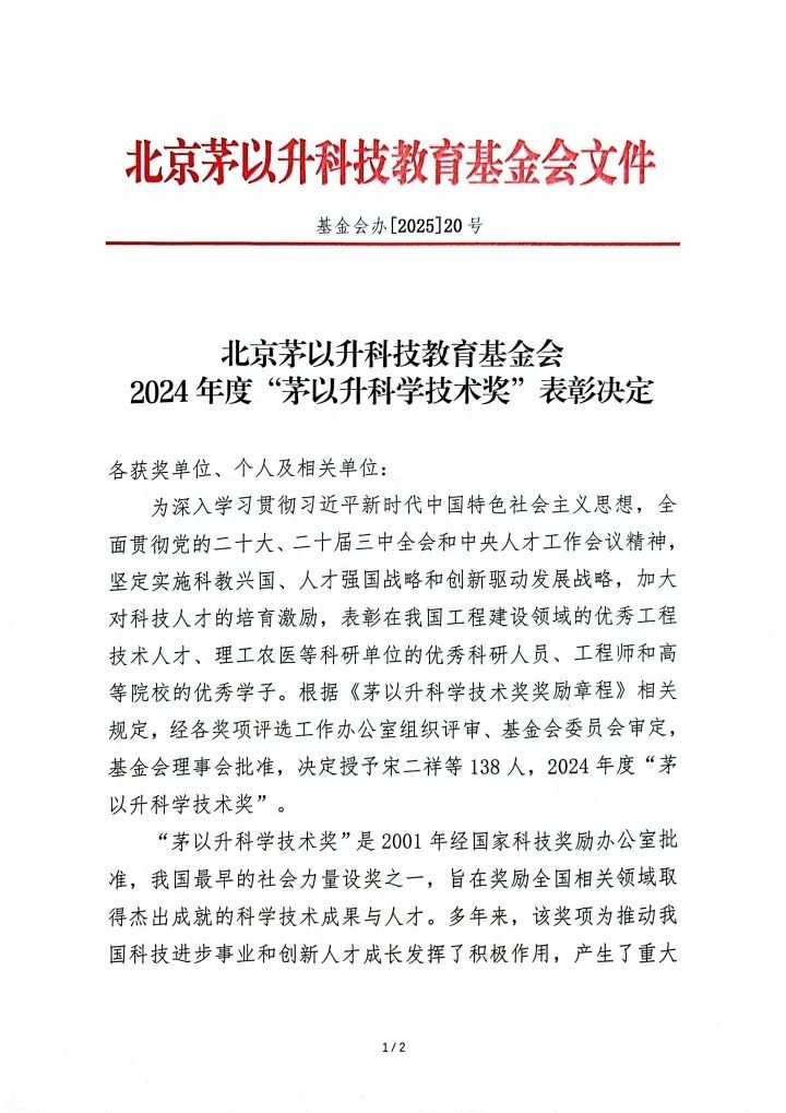 近日,北京茅以升科技教育基金会正式发布2024年度“茅以升科学技术奖”表彰决定(基金会办〔2025〕20号)。2024年度“茅以升科学技术奖”根据《茅以升科学技术奖励章程》相关规定,经各奖项评选工作办公室组织评审、基金会委员会审定、基金会理事会批准,最终确定138人荣获2024年度茅以升科学技术奖。